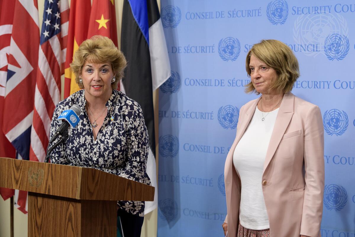 Geraldine Byrne Nason (left), Permanent Representative of Ireland to the United Nations, and Mona Juul, Permanent Representative of Norway to the United Nations, brief reporters after the Security Council unanimously adopts a resolution on humanitarian aid in Syria.