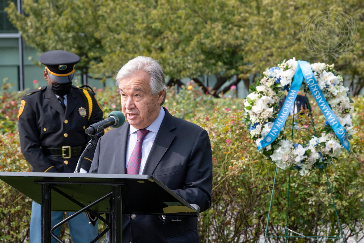 Secretary-General António Guterres addresses the wreath-laying ceremony commemorating the 59th anniversary of the death of former Secretary-General Dag Hammarskjöld.