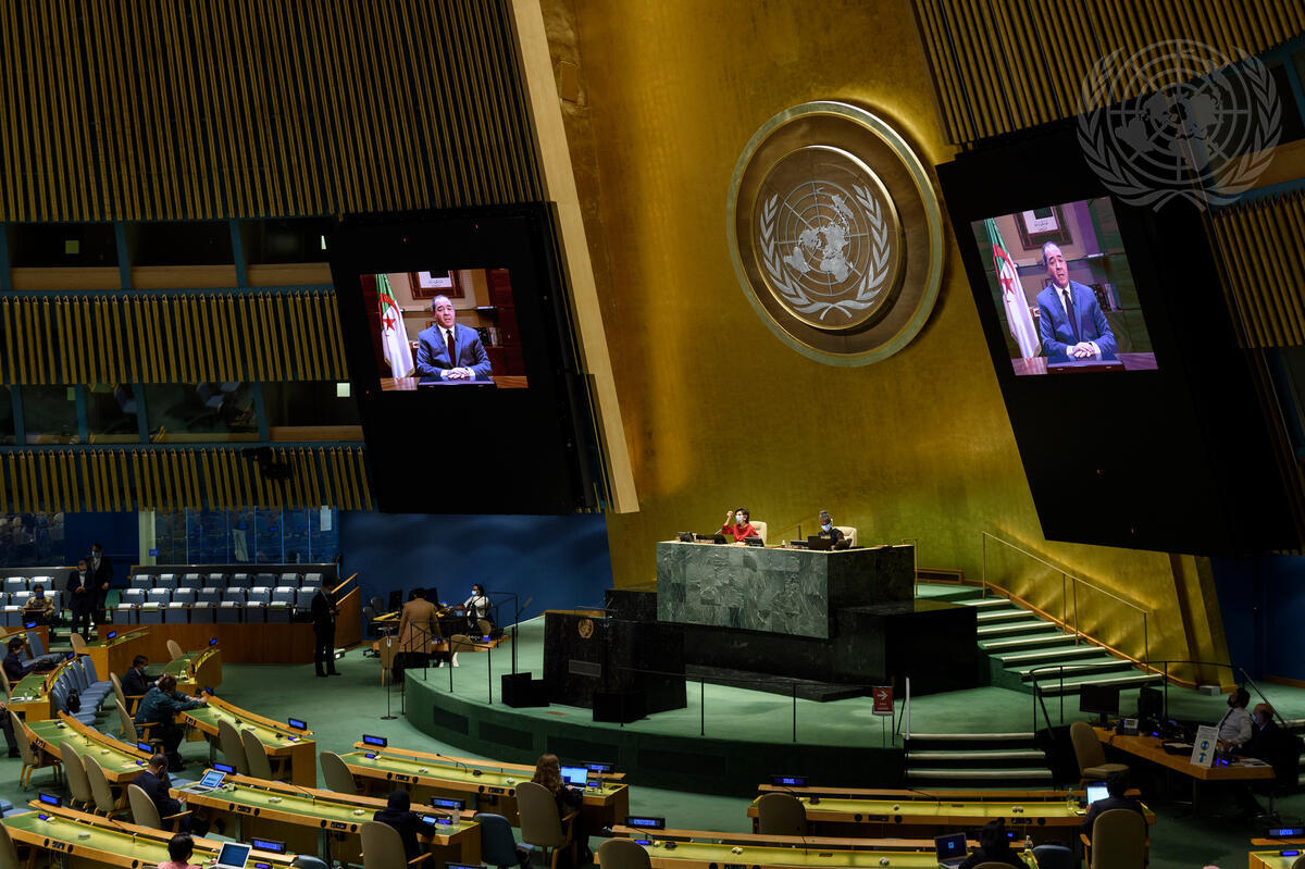 Sabri Boukadoum (on screens), Minister of Foreign Affairs of Algeria, addresses the General Assembly high-level plenary meeting to commemorate and promote the International Day for the Total Elimination of Nuclear Weapons (26 September).