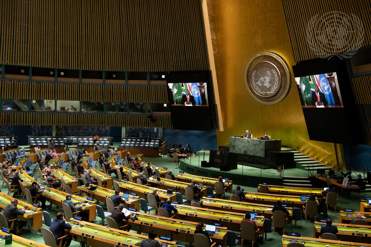 Matamela Cyril Ramaphosa (on screens), President of the Republic of South Africa, addresses the General Assembly high-level plenary meeting to commemorate and promote the International Day for the Total Elimination of Nuclear Weapons (26 September).