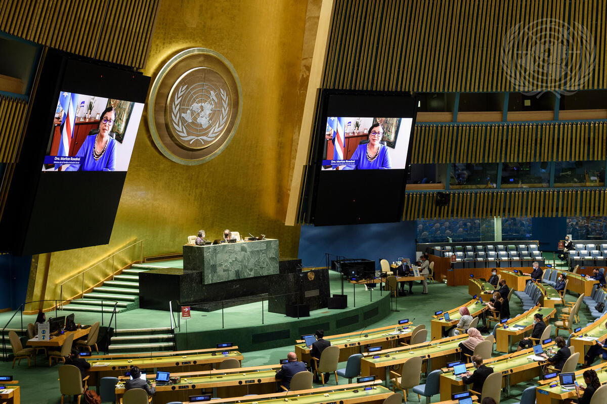 Maritza Rosabal Pena (on screens), Minister of Education, Family and Social Inclusion of Cabo Verde, addresses the General Assembly high-level meeting on the twenty-fifth anniversary of the Fourth World Conference on Women.