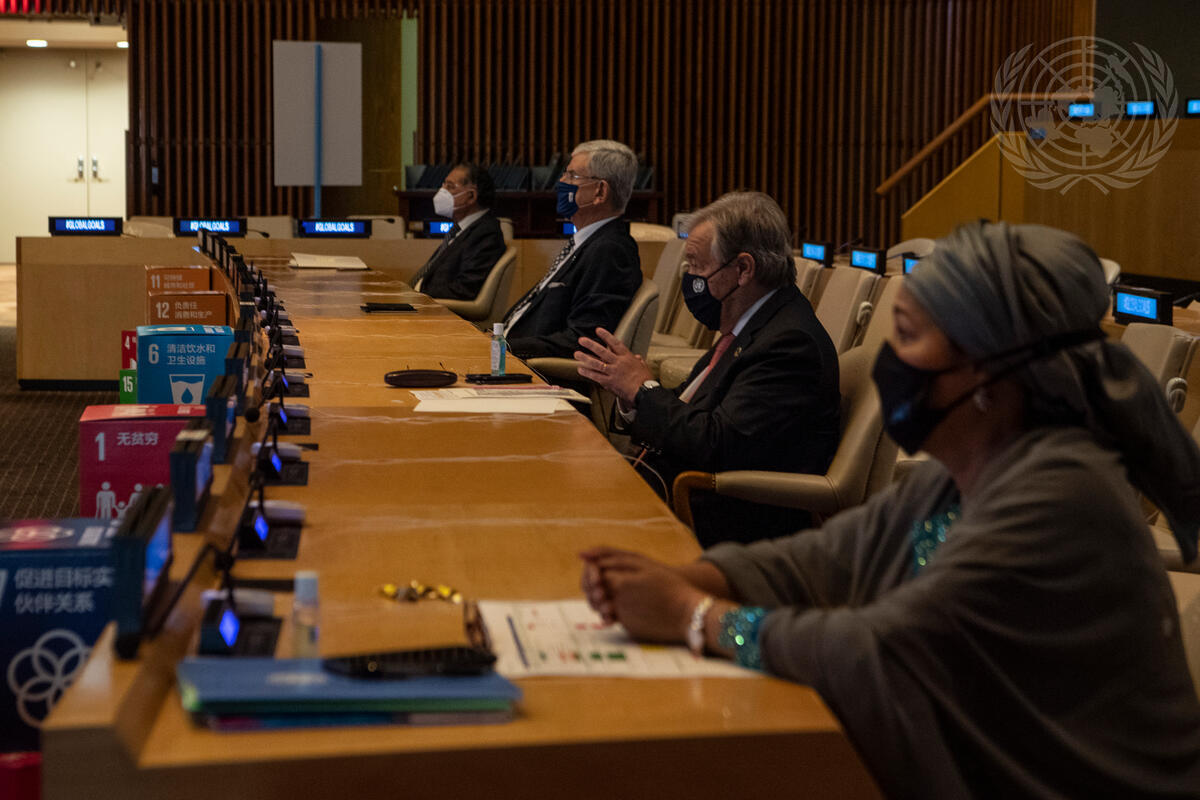 Seated from right to left are: Deputy Secretary-General Amina Mohammed; Secretary-General António Guterres; and Volkan Bozkir, President of the seventy-fifth session of the United Nations General Assembly.