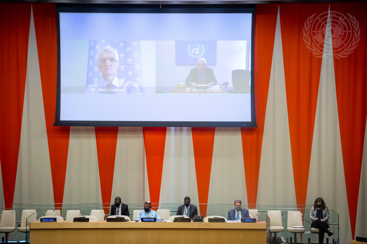 A view of the Security Council meeting on the situation in the Middle East (Yemen). On the screen is (at left) Mark Lowcock, Under-Secretary-General for Humanitarian Affairs and Emergency Relief Coordinator, and at right Martin Griffiths, Special Envoy of the Secretary-General for Yemen.