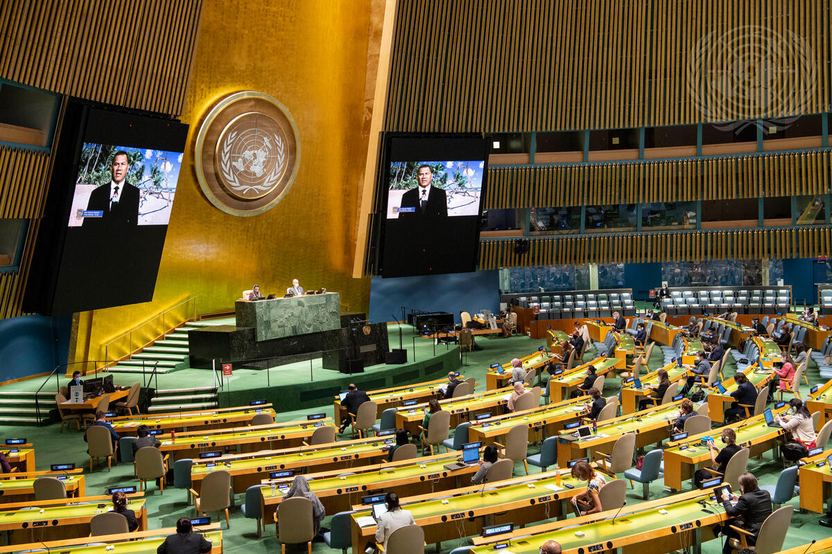 Kausea Natano (on screens), Prime Minister of Tuvalu, addresses the General Assembly high-level meeting on the twenty-fifth anniversary of the Fourth World Conference on Women.