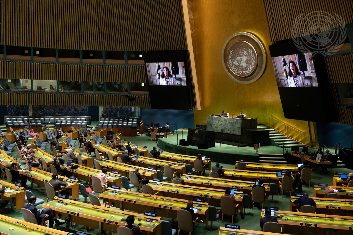 Ann Christin Linde (on screens), Minister for Foreign Affairs of Sweden, addresses the General Assembly high-level plenary meeting to commemorate and promote the International Day for the Total Elimination of Nuclear Weapons (26 September).