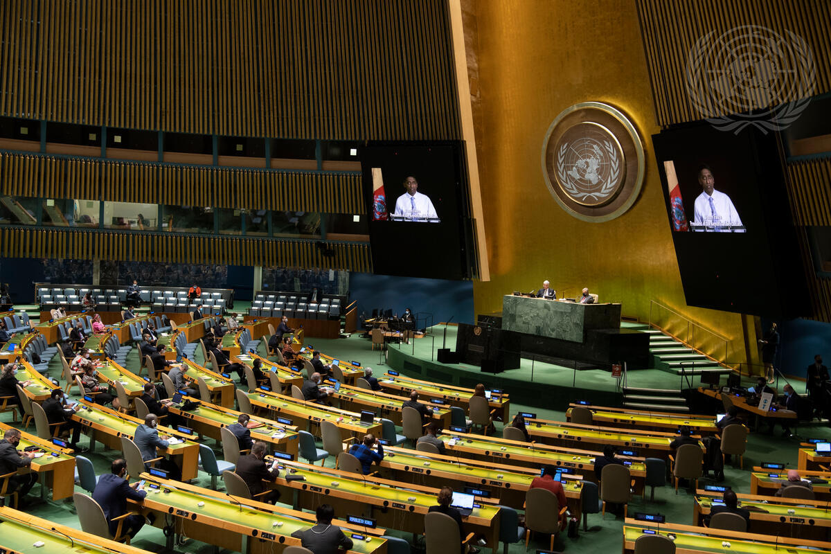 Danny Faure (on screens), President of the Republic of Seychelles, addresses the General Assembly high-level plenary meeting to commemorate and promote the International Day for the Total Elimination of Nuclear Weapons (26 September).