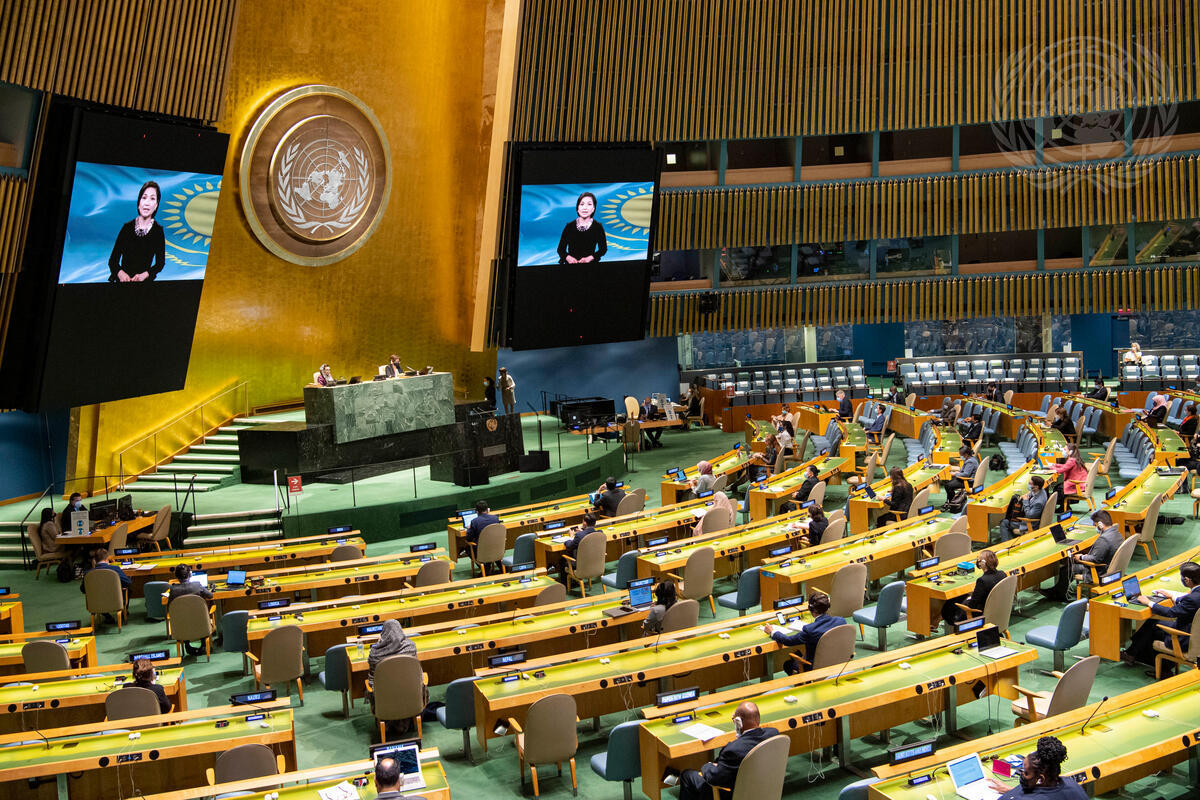 Lazzat Ramazanova (on screens), Deputy Prime Minister and Chair of the National Commission on the Rights of Women of Kazakhstan, addresses the General Assembly high-level meeting on the twenty-fifth anniversary of the Fourth World Conference on Women.