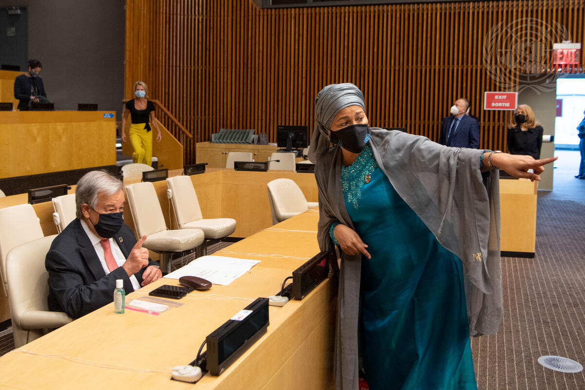 The Secretary-General (seated) speaks with Deputy Secretary-General Amina Mohammed during the event.