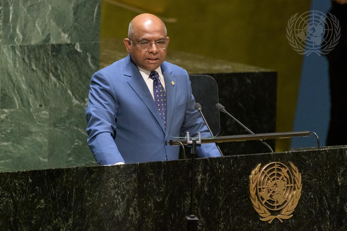 Abdulla Shahid, President of the seventy-sixth session of the United Nations General Assembly, addresses the General Assembly commemorative plenary meeting to mark the International Day of Remembrance of the Victims of Slavery and the Transatlantic Slave Trade.