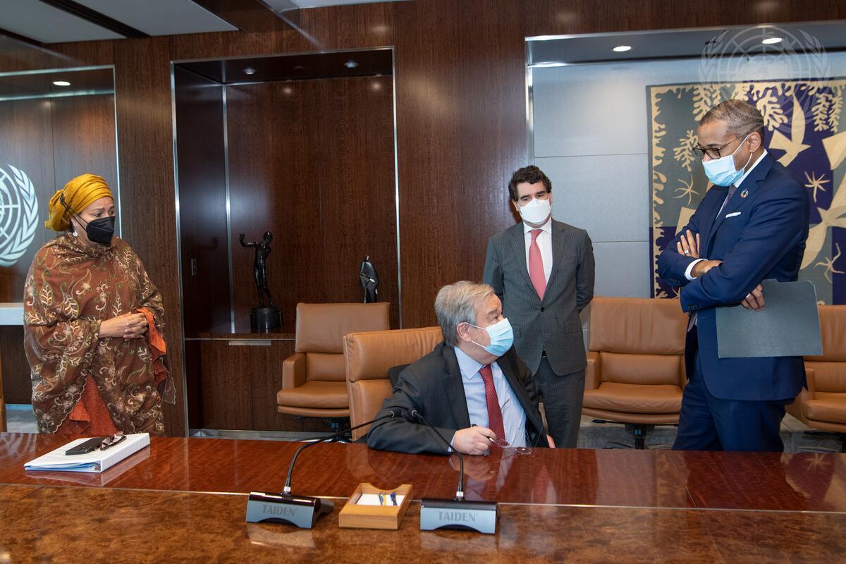 Secretary-General António Guterres (centre left) speaks with Courteney Rattray (far right), Chef de Cabinet, and Amina Mohammed, Deputy-Secretary-General (far left).