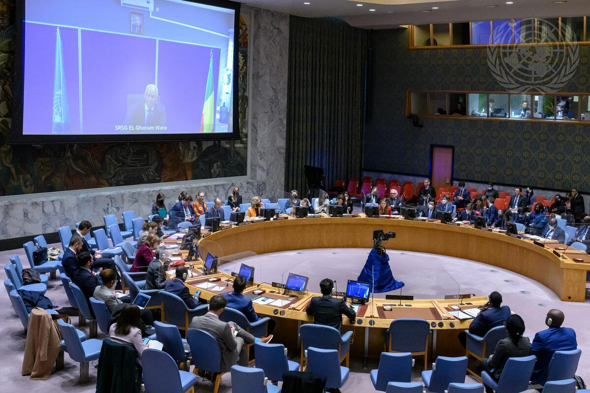 El-Ghassim Wane (on screen), Special Representative of the Secretary-General and Head of the United Nations Multidimensional Integrated Stabilization Mission in Mali, briefs the Security Council meeting on the situation in Mali.