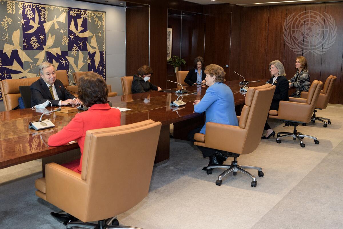 Secretary-General António Guterres (left) meets with United States Senators. From left to right, back to camera: Susan Collins of Maine, Jeanne Shaheen of New Hampshire. and Joni Ernst of Iowa.
