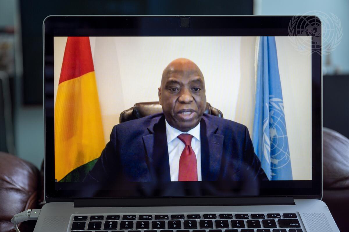Morissanda Kouyaté, Minister of Foreign Affairs, International Cooperation, African Integration and Guineans Living Abroad of the Republic of Guinea, addresses, on behalf of the Chair country of the Group of 77 for the year 2021, the opening of the ceremonial meeting to mark the formal handover of the chairmanship of the Group of 77 from Guinea to Pakistan.