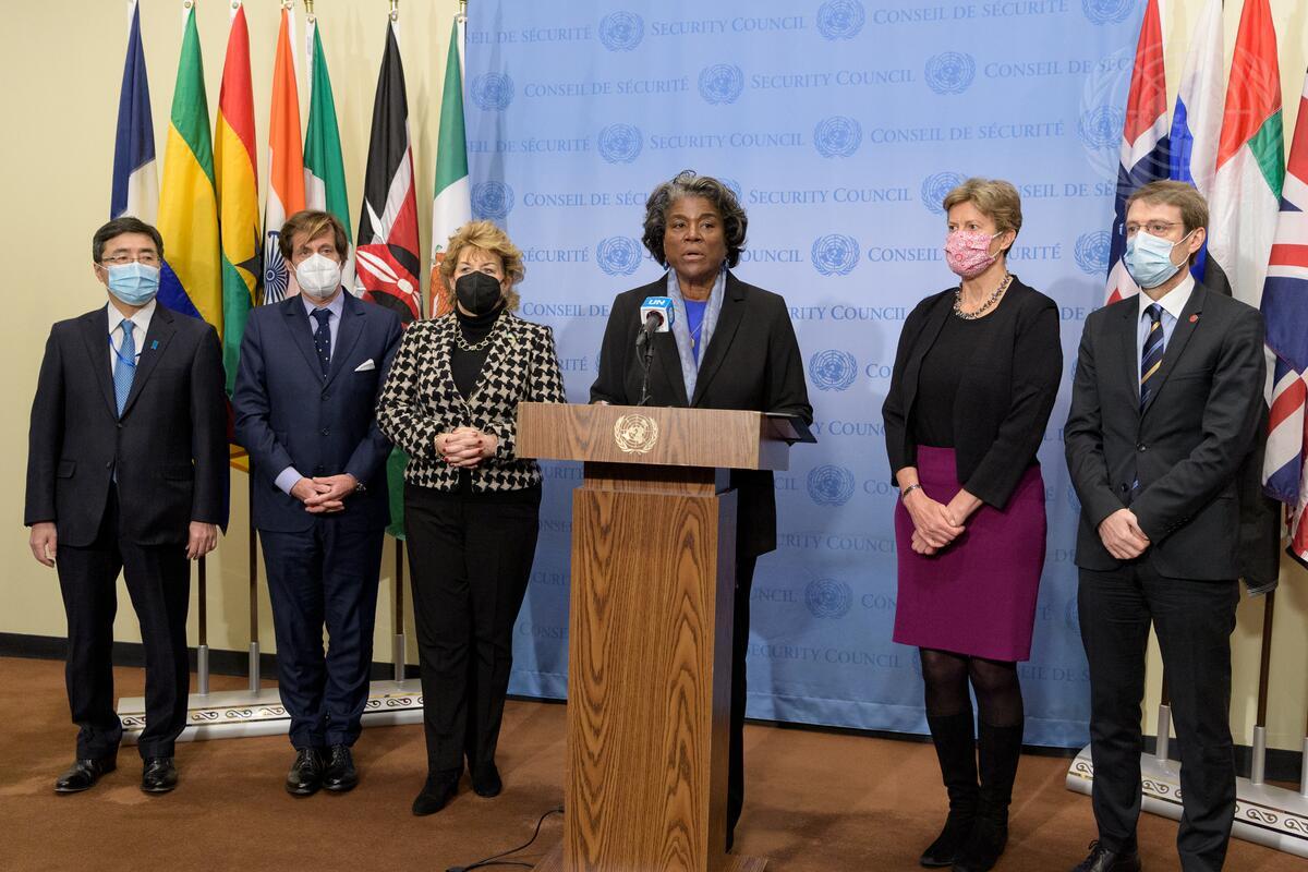 Linda Thomas-Greenfield (at podium), Permanent Representative of the United States to the United Nations, briefs reporters on the situation in the Democratic People's Republic of Korea.