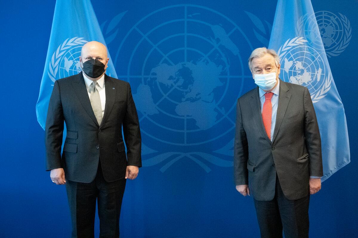 Secretary-General António Guterres (right ) meets with Karim A. A. Khan, Prosecutor of the International Criminal Court.
