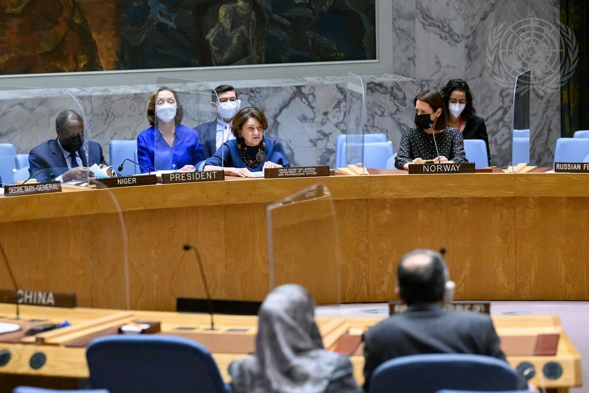 Rosemary DiCarlo (centre of table), Under-Secretary-General for Political and Peacebuilding Affairs, briefs the Security Council meeting on Non-proliferation.