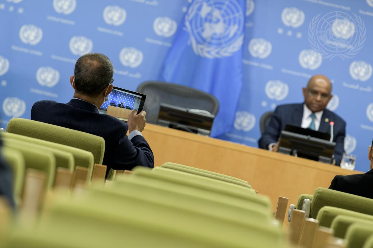 A view of the press conference with Abdulla Shahid, President of the seventy-sixth session of the United Nations General Assembly, as he briefs reporters on a number of topics such as Covid-19 vaccine, climate change, gender equality and more.