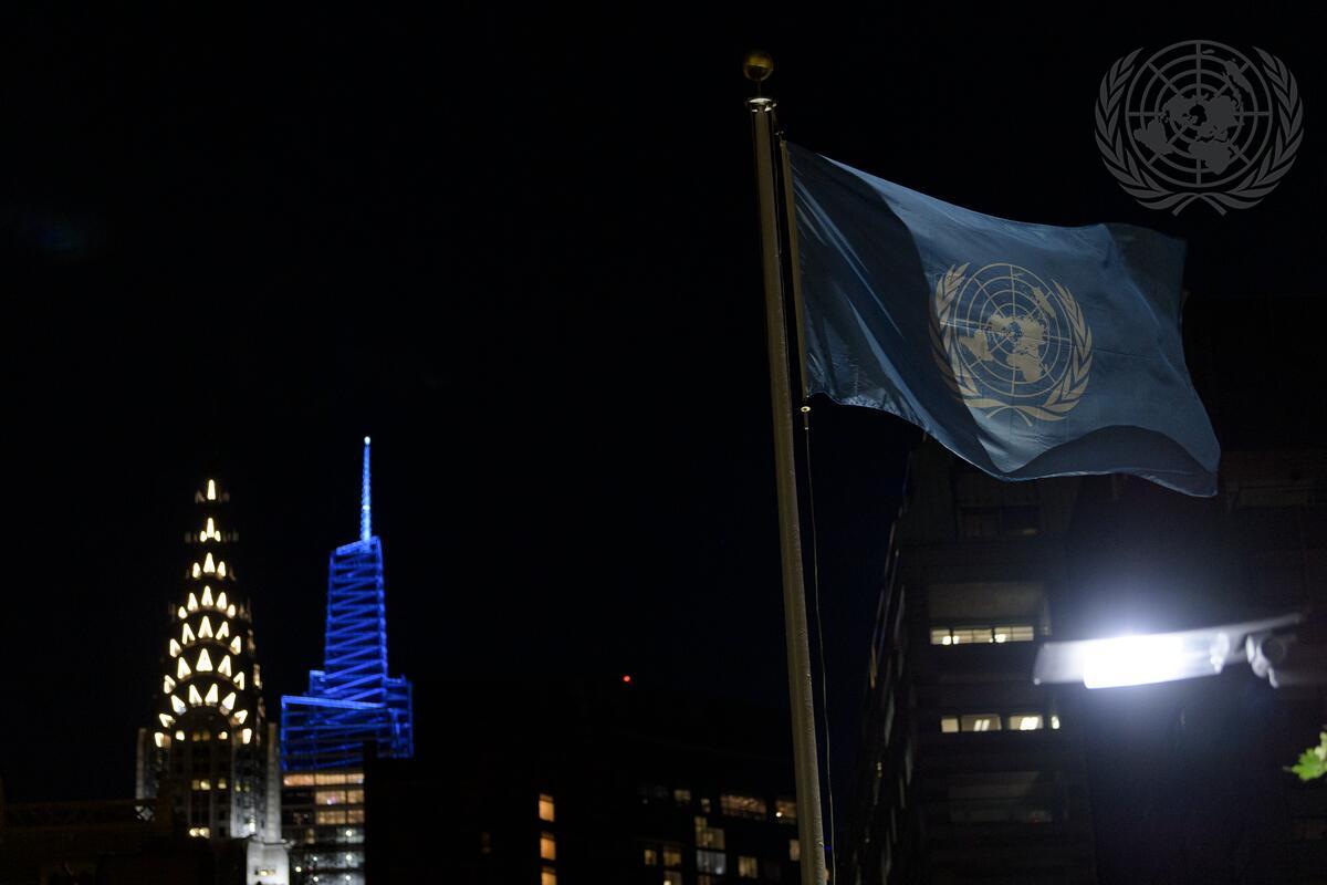 An evening view of the UN flag in front of the Chrysler building as seen from UN Headquarters.