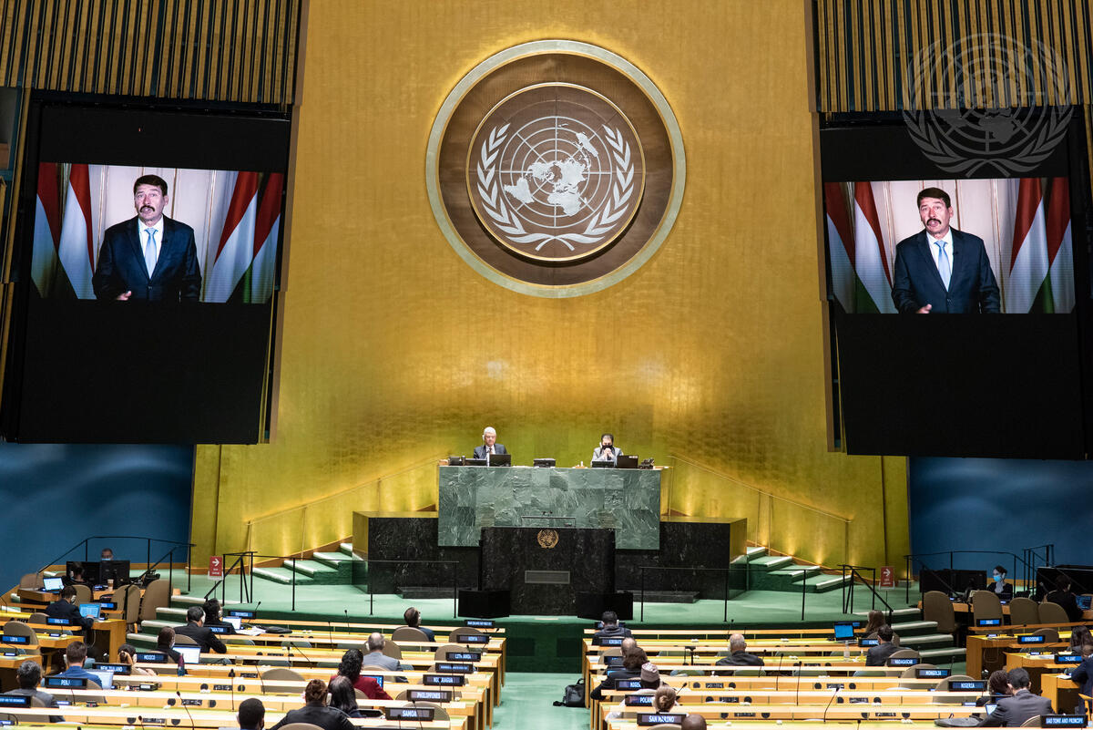 János Áder (on screens), President of Hungary, addresses the general debate of the General Assembly’s seventy-fifth session.