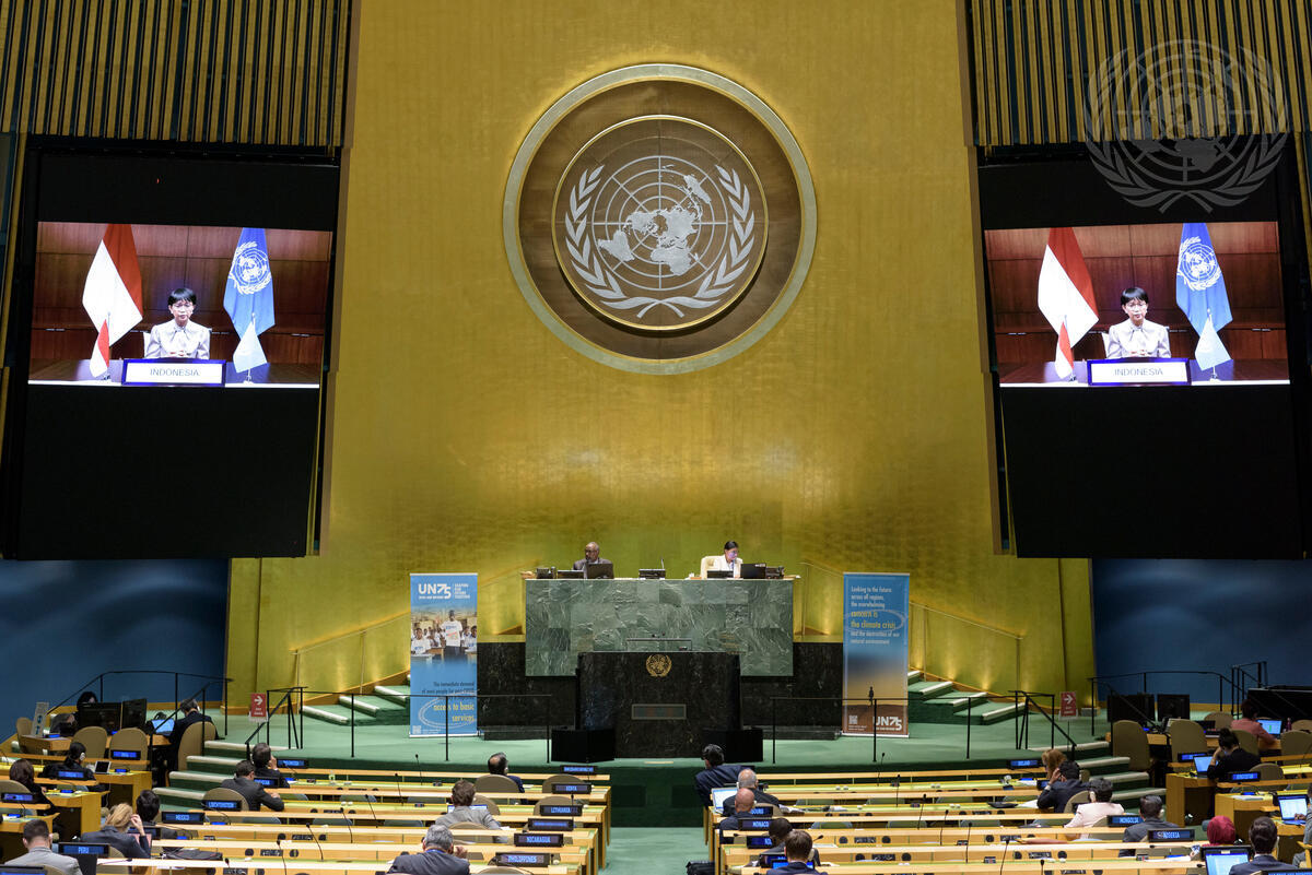 Retno Lestari Priansari Marsudi (on screens), Minister for Foreign Affairs of the Republic of Indonesia, addresses the high-level meeting of the General Assembly to commemorate the seventy-fifth anniversary of the United Nations.