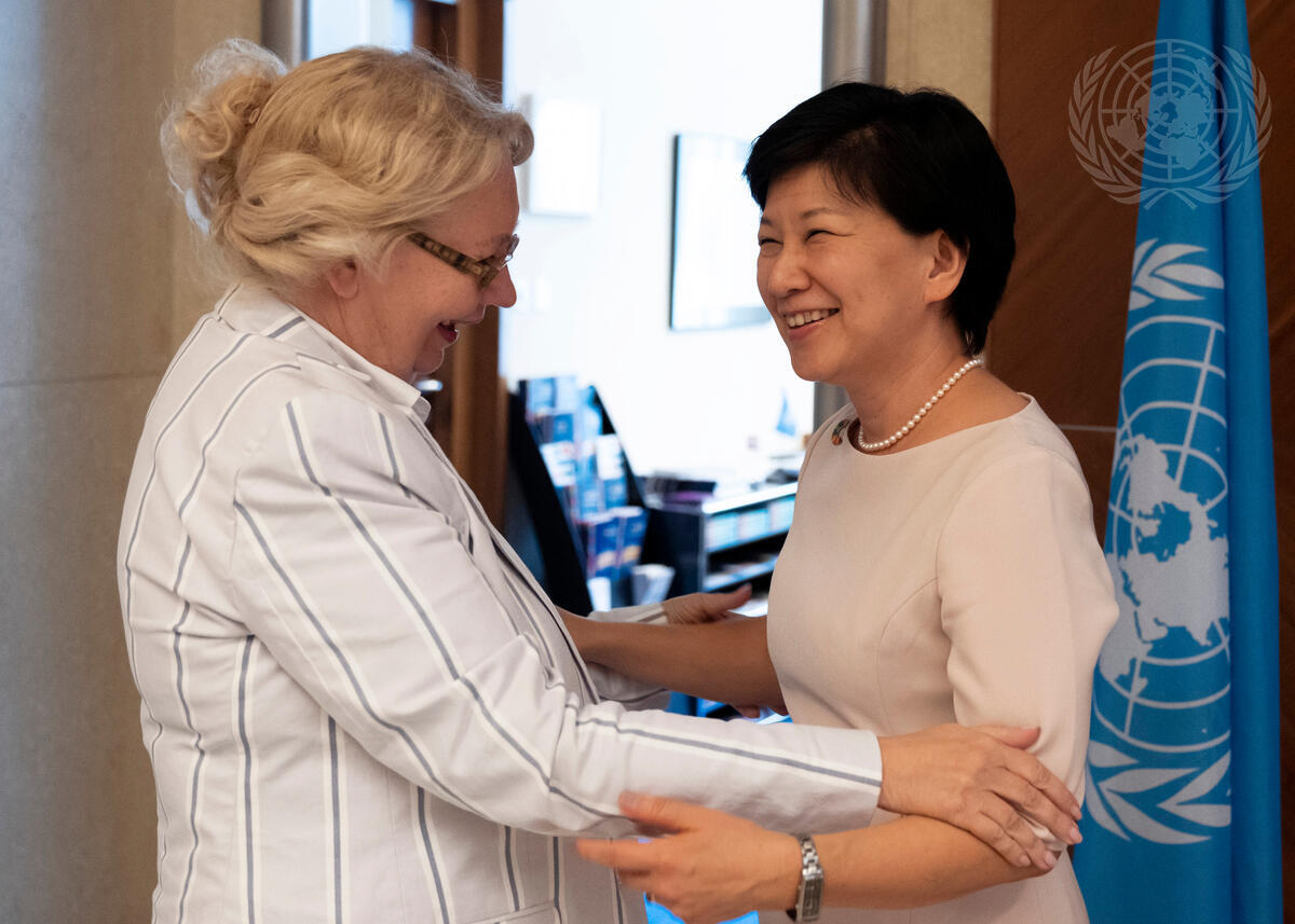 Tatiana Valovaya (left), Director-General of the UN Office at Geneva (UNOG), speaks with Izumi Nakamitsu, High Representative for Disarmament Affairs, during the 3rd Part of the Conference on Disarmament in Geneva.