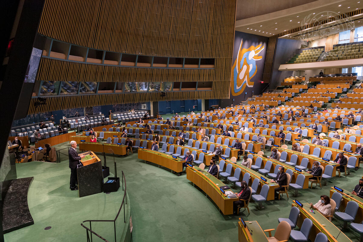 A wide view of the General Assembly Hall as Volkan Bozkir (at podium), President of the seventy-fifth session of the United Nations General Assembly, opens the general debate of the General Assembly’s seventy-fifth session.