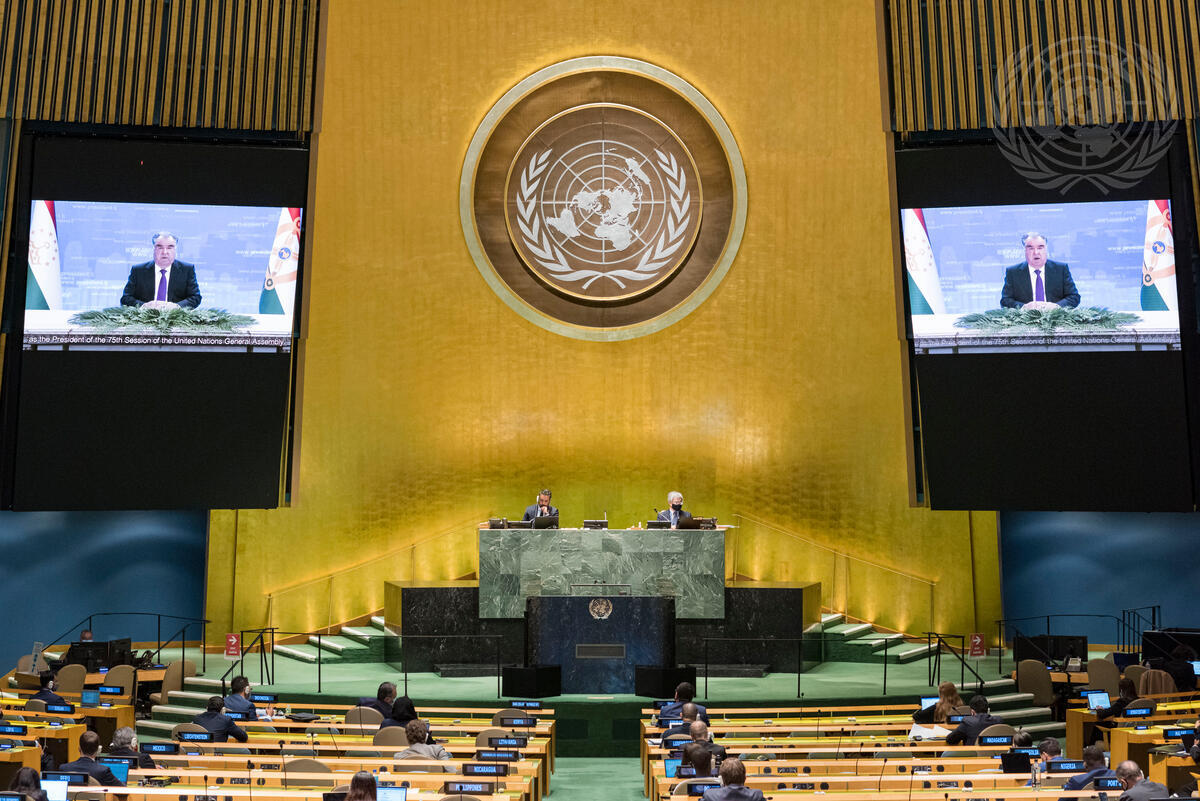 Emomali Rahmon (on screens), President of the Republic of Tajikistan, addresses the general debate of the General Assembly’s seventy-fifth session.