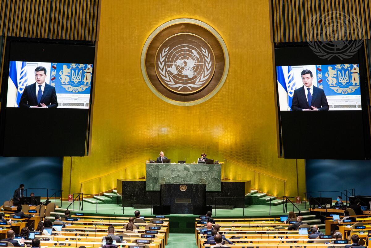 Volodymyr Zelenskyy (on screens), President of Ukraine, addresses the general debate of the General Assembly’s seventy-fifth session.