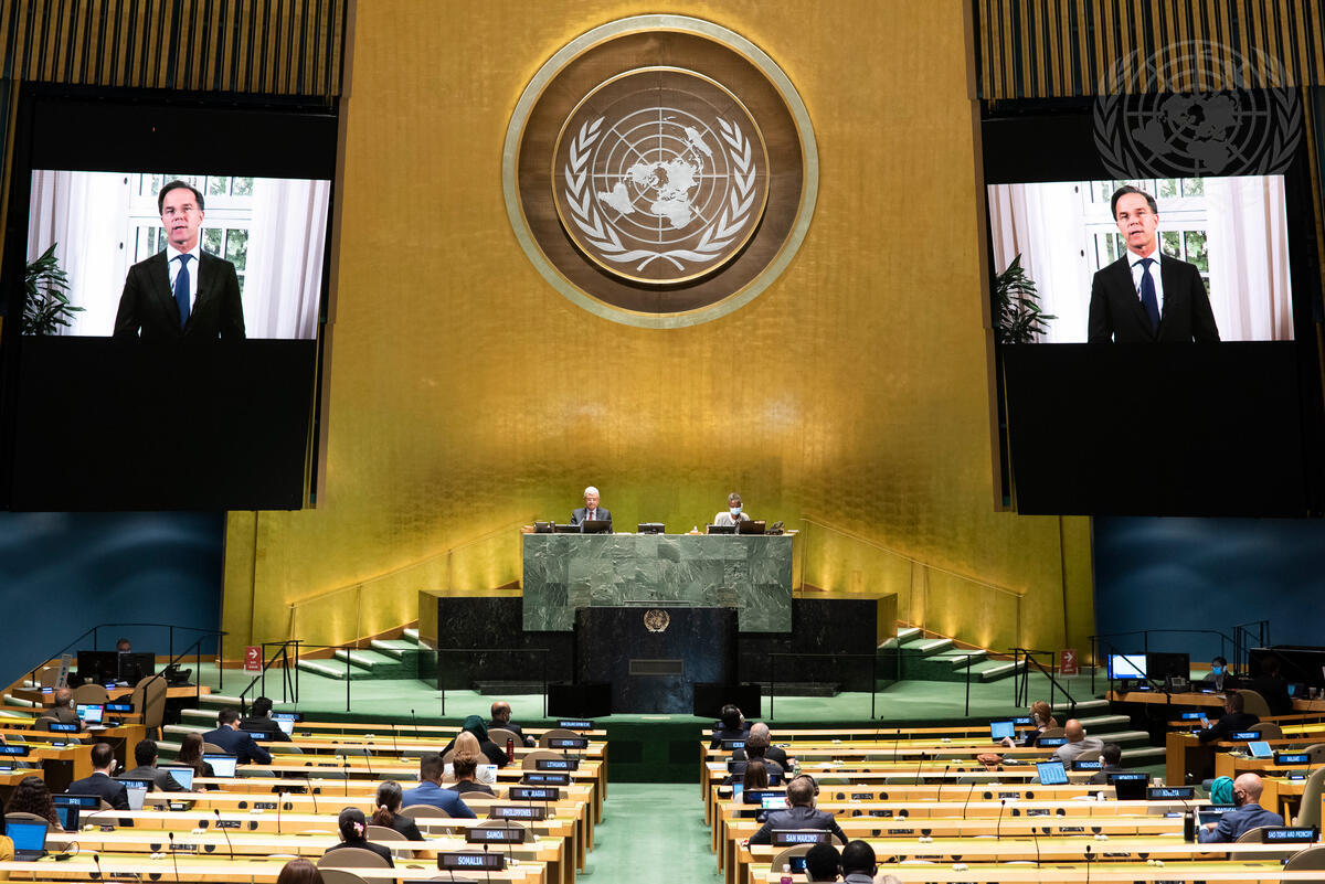 Mark Rutte (on screens), Prime Minister and Minister for General Affairs of the Kingdom of the Netherlands, addresses the general debate of the General Assembly’s seventy-fifth session.
