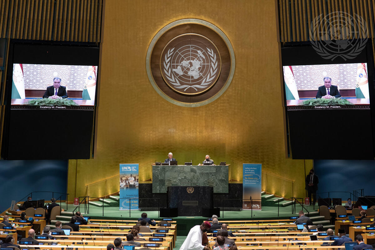 Emomali Rahmon (on screens), President of the Republic of Tajikistan, addresses the high-level meeting of the General Assembly to commemorate the seventy-fifth anniversary of the United Nations.