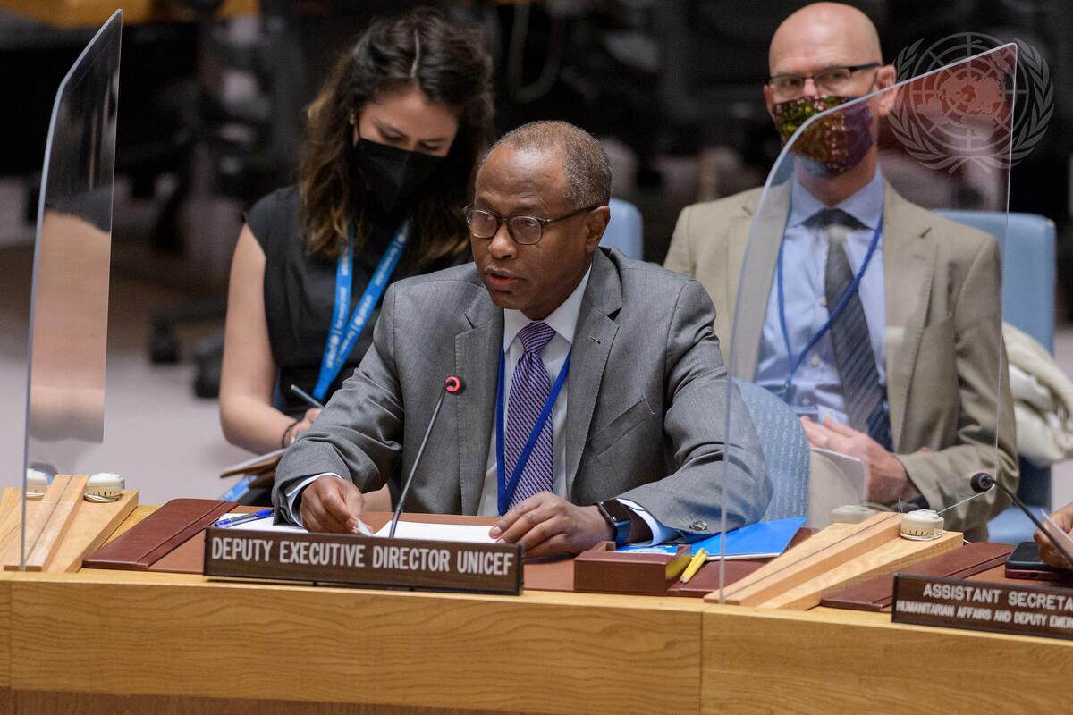 Omar Abdi, Deputy Executive Director for Programmes of the United Nations Children's Fund (UNICEF), briefs the Security Council meeting on maintenance of peace and security of Ukraine.