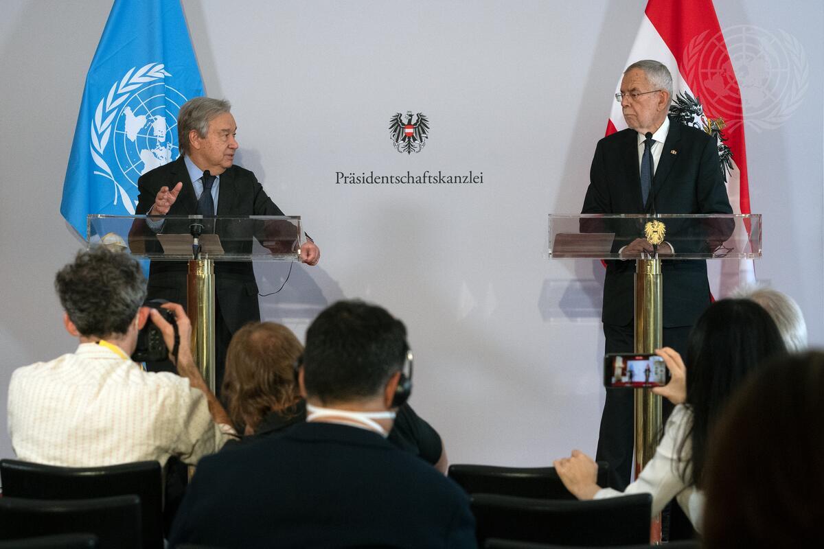 Secretary-General António Guterres (at left podium) briefs reporters together with Alexander Van der Bellen (right podium), Federal President of the Republic of Austria, during the Secretary-General's visit to the country.