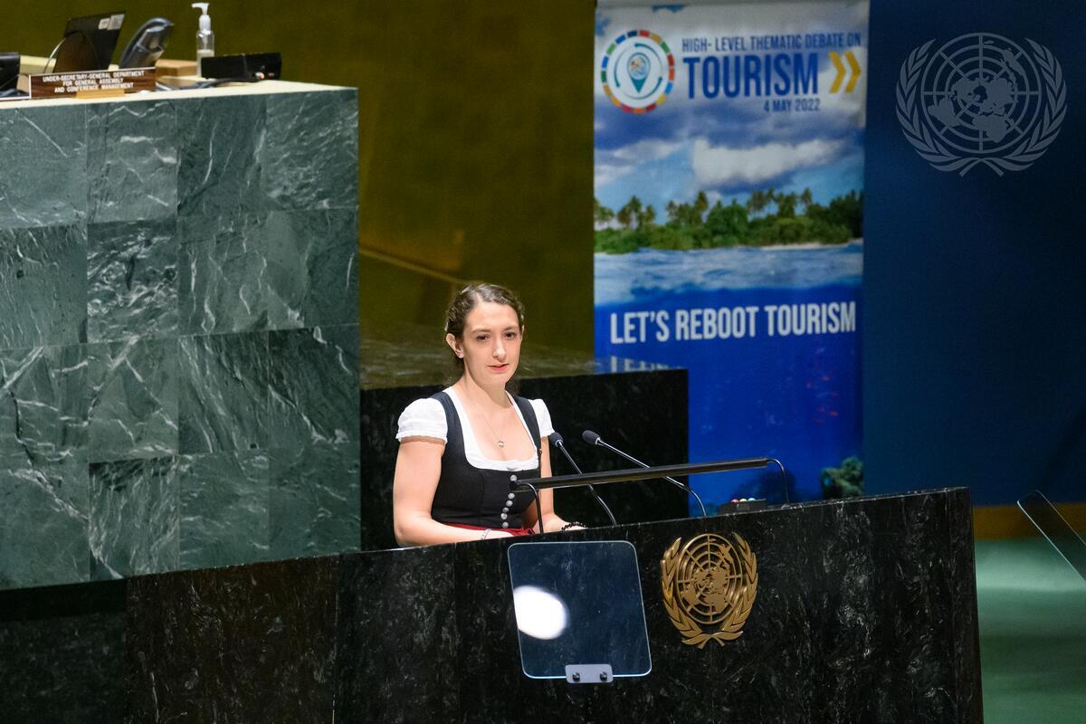 Sarah Raich, Vice Mayor of Kaunertal, Austria, World Tourism Organization (UNWTO) Best Tourism Village Winner, addresses the General Assembly high-level thematic debate on "Putting sustainable and resilient tourism at the heart of an inclusive recovery". This event provides opportunity for Member States and other stakeholders to discuss strategies, share best practices and experiences in the tourism industry through three high-level thematic roundtables on inclusion, climate friendly transformations and sustainable investments to stimulate the sector post COVID-19.