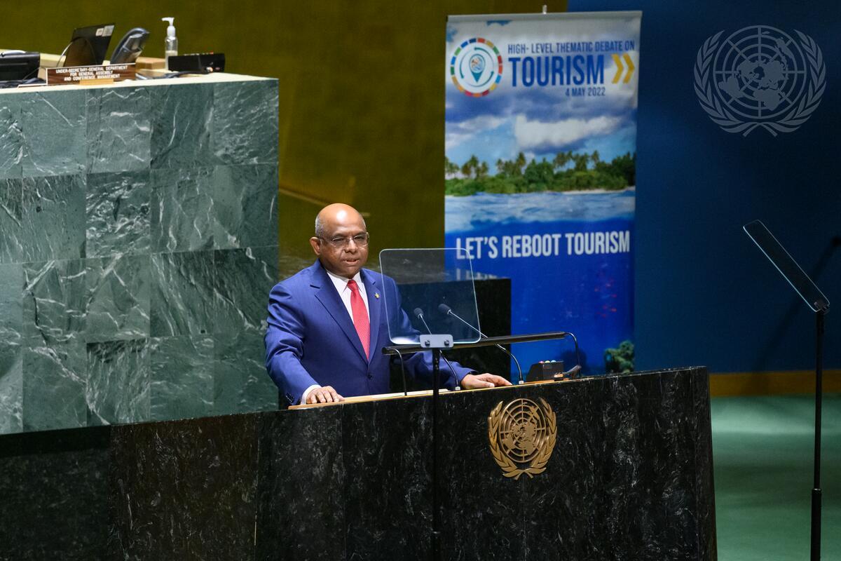 Abdulla Shahid, President of the seventy-sixth session of the United Nations General Assembly, addresses the General Assembly high-level thematic debate on "Putting sustainable and resilient tourism at the heart of an inclusive recovery". This event provides opportunity for Member States and other stakeholders to discuss strategies, share best practices and experiences in the tourism industry through three high-level thematic roundtables on inclusion, climate friendly transformations and sustainable investments to stimulate the sector post COVID-19.