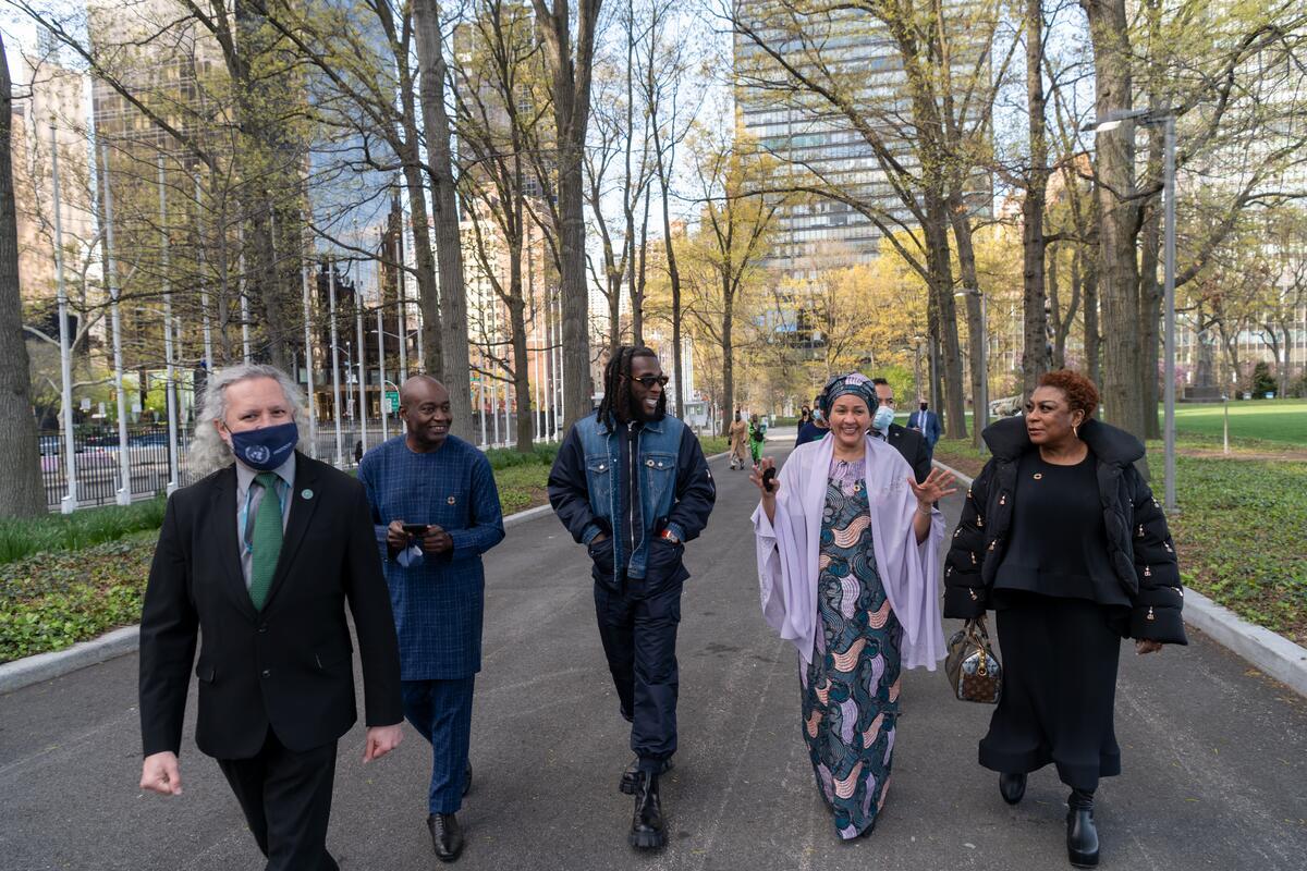 Damini Ebunoluwa Ogulu "Burna Boy" (centre), Nigerian singer and rapper, visits the UN Headquarters and meets with Deputy Secretary-General Amina Mohammed (second from right).