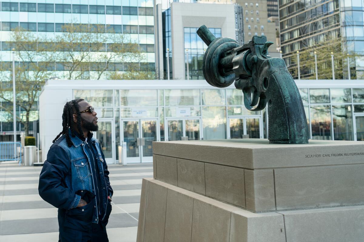 Burna Boy visits the “Non-Violence” or “Knotted Gun” sculpture by artist Carl Fredrik Reuterswärd.