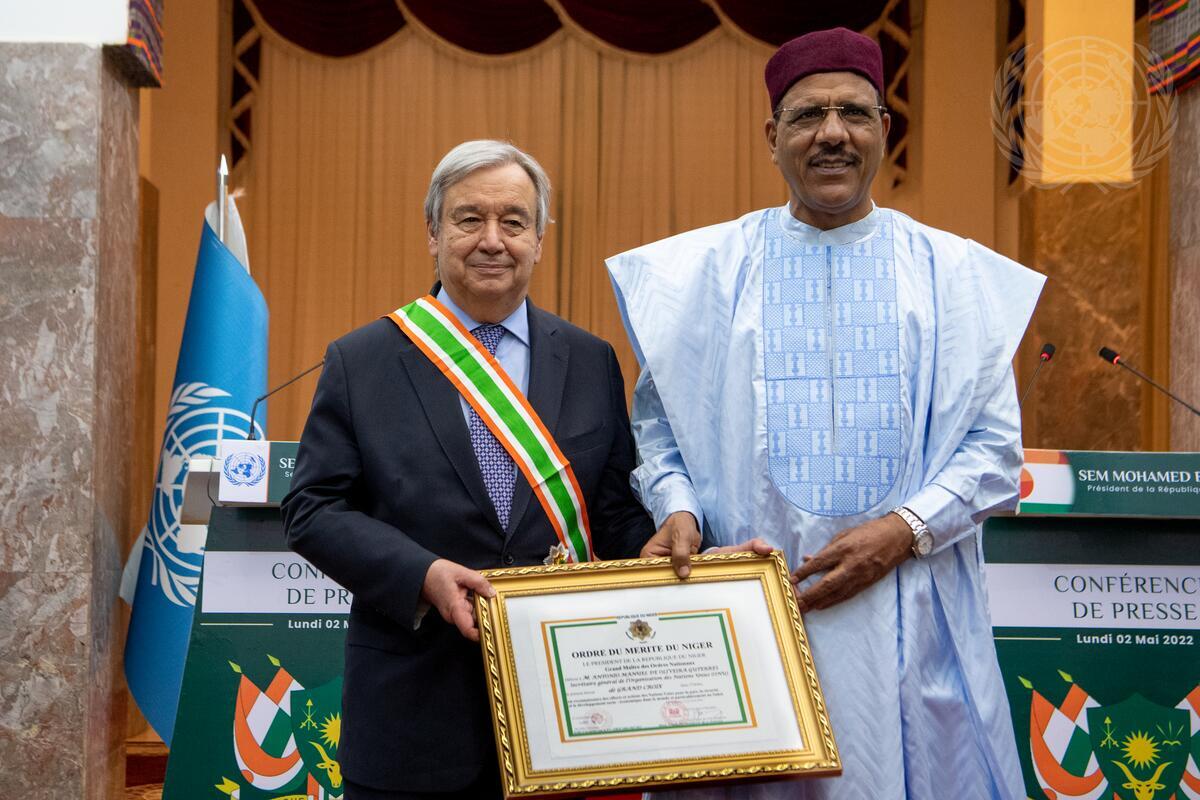 Secretary-General António Guterres (left) meets with Mohamed Bazoum, President of the Republic of Niger, during his visit to the country.