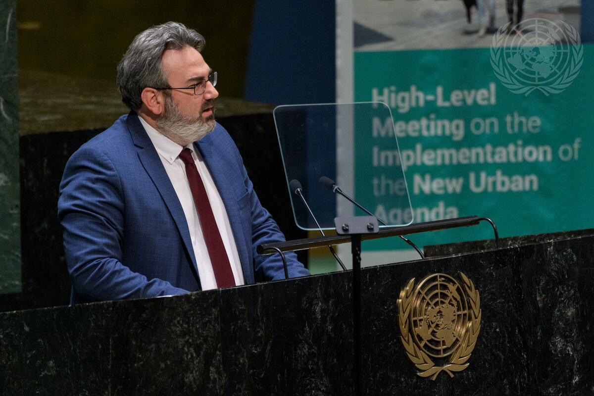 Efthimios Bakogiannis, Secretary-General for Territorial Development and Urban Environment of the Ministry of the Environment and Energy of Greece, addresses the high-level meeting of the General Assembly to assess the implementation of the New Urban Agenda.