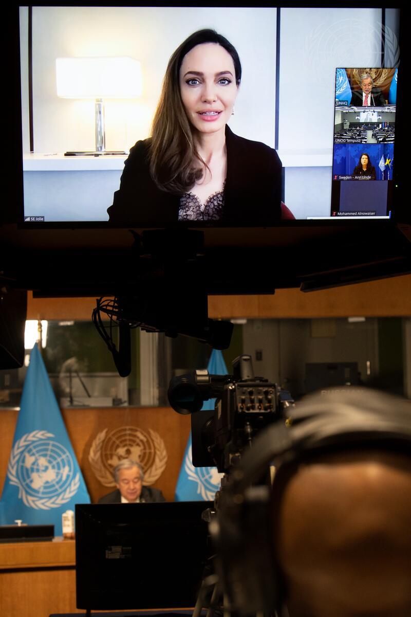 Angelina Jolie (on screen), Special Envoy of the UN Refugee Agency (UNHCR), speaks at the virtual High-level Pledging Event for the Humanitarian Crisis in Yemen. Chairing the meeting is Secretary-General António Guterres (below).