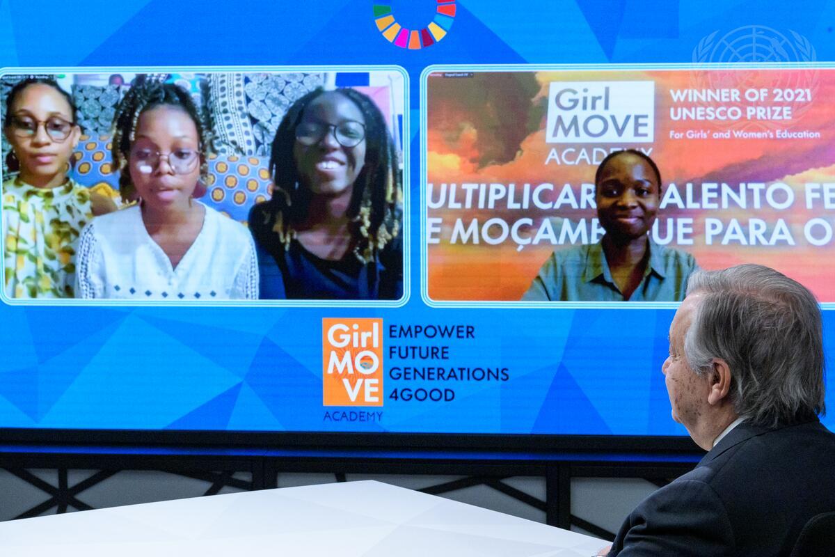 Secretary-General António Guterres (right) meets virtually with Girl MOVE Academy, a Grassroots Leadership Academy that creates innovative models of education to amplify talent, raise gender equality and promote sustainable transformation.