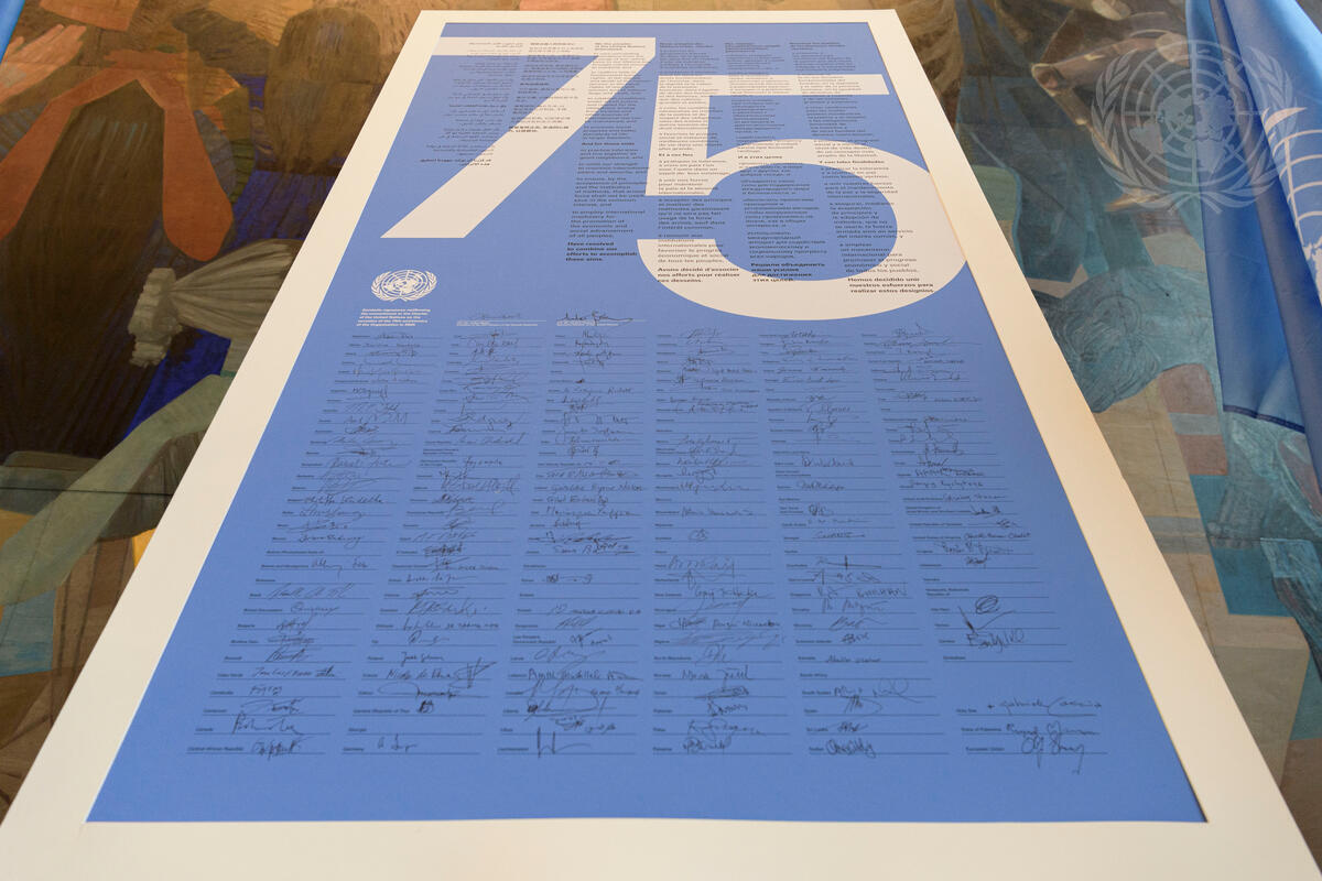 To commemorate the 75th anniversary of the United Nations (24 October), Volkan Bozkir, President of the seventy-fifth session of the United Nations General Assembly, has invited all Member and Observer States to sign the preamble of the UN Charter as a symbolic gesture of recommitment to its principles. The signed poster will be displayed in the General Assembly Hall on 26 October, during the mandated General Assembly UN Day observance event.