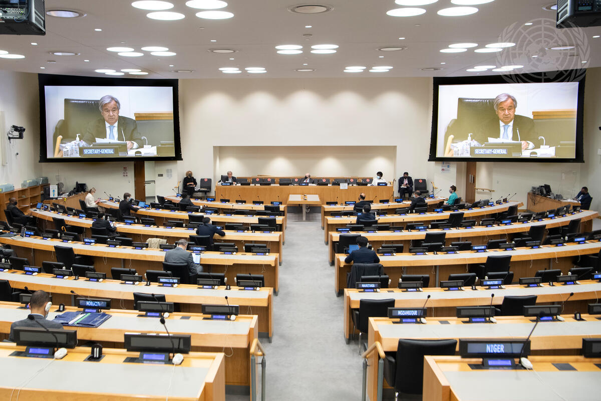 Secretary-General António Guterres (left at dais and on screens) makes remarks to a meeting of the Fifth Committee of the 75th session of the General Assembly.