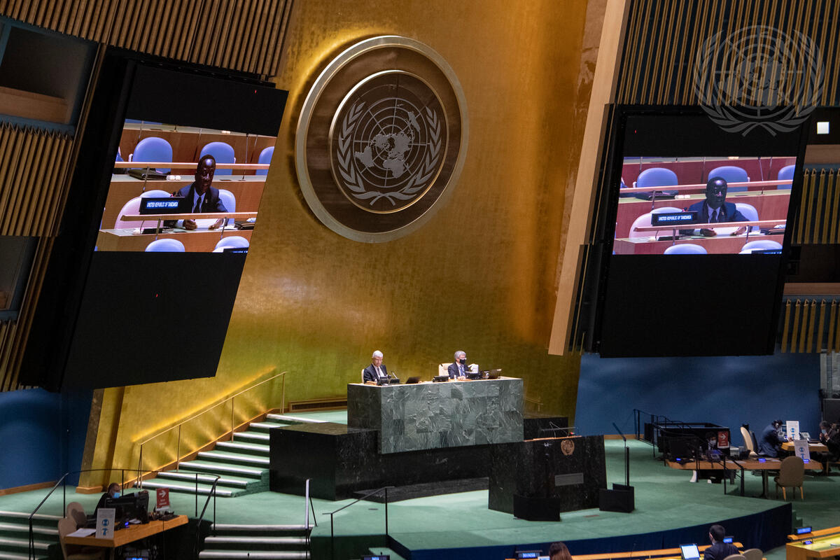 Kennedy Godfrey Gastorn (on screens), new Permanent Representative of the United Republic of Tanzania to the United Nations, addresses the resumed high-level meeting of the General Assembly to commemorate the seventy-fifth anniversary of the United Nations.