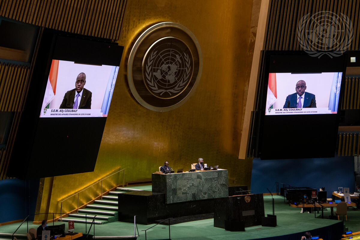 Ally Coulibaly, Minister of Foreign Affairs of Côte d'Ivoire, addresses the resumed high-level meeting of the General Assembly to commemorate the seventy-fifth anniversary of the United Nations.