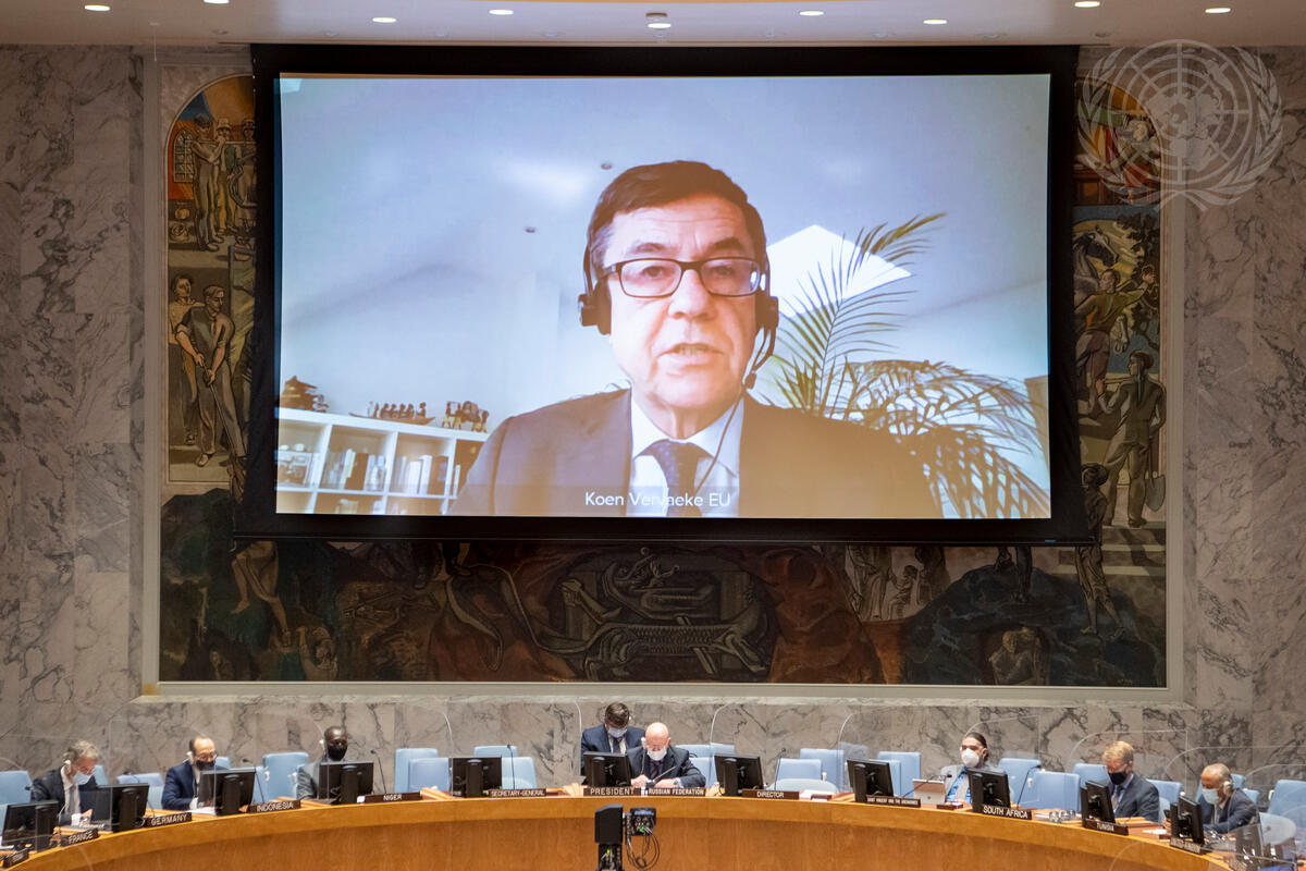 Koen Vervaeke (on screen), Managing Director for Africa at the European External Action Service (EEAS), briefs the Security Council meeting on the situation in the Central African Republic.