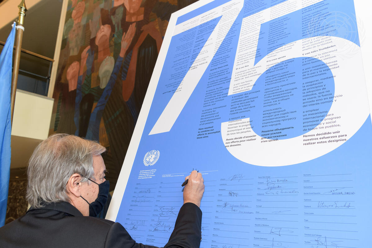 To commemorate the 75th anniversary of the United Nations (24 October), Volkan Bozkir, President of the seventy-fifth session of the United Nations General Assembly, has invited all Member and Observer States to sign the preamble of the UN Charter as a symbolic gesture of recommitment to its principles. The signed poster will be displayed in the General Assembly Hall on 26 October, during the mandated General Assembly UN Day observance event.
