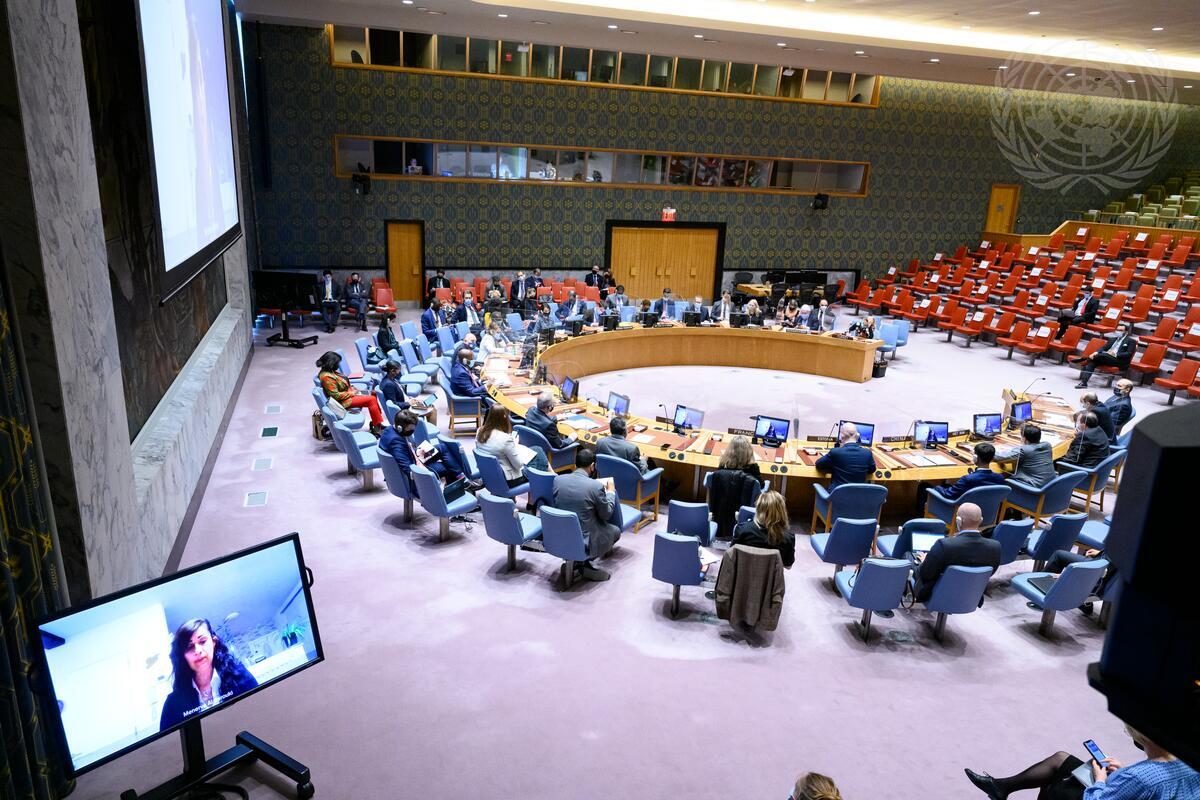 Mounerfah Albarouki (on screen), General Coordinator of the Syrian National Conference, addresses the Security Council meeting on the situation in the Middle East (Syria).