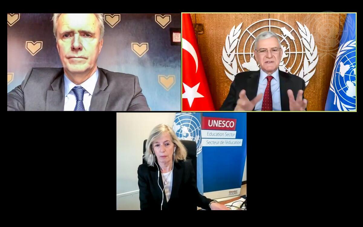At upper left is Odd-Inge Kvalheim, Deputy Permanent Representative of Norway to the UN, and below is moderator Stefania Giannini, Assistant Director-General for Education of UNESCO.