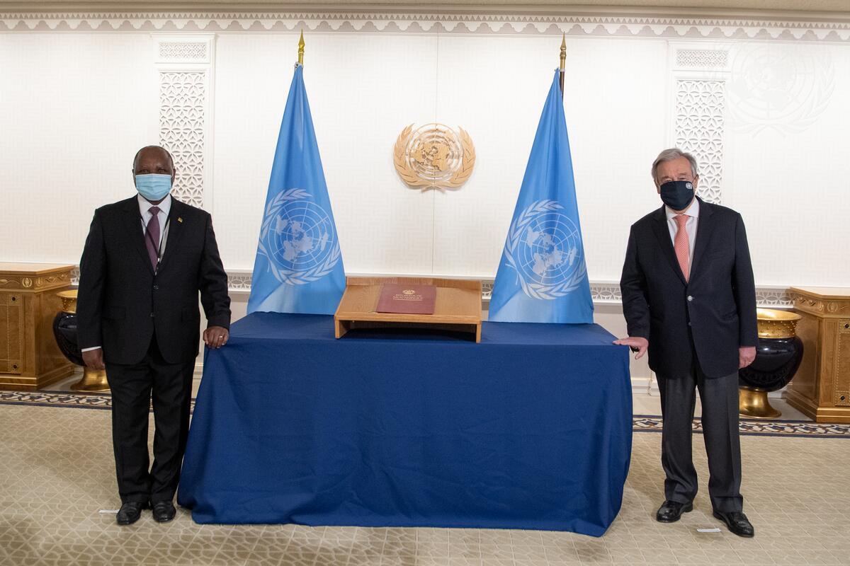 Pedro Comissário Afonso (left), new Permanent Representative of Mozambique to the United Nations, pays a courtesy call to Secretary-General António Guterres.