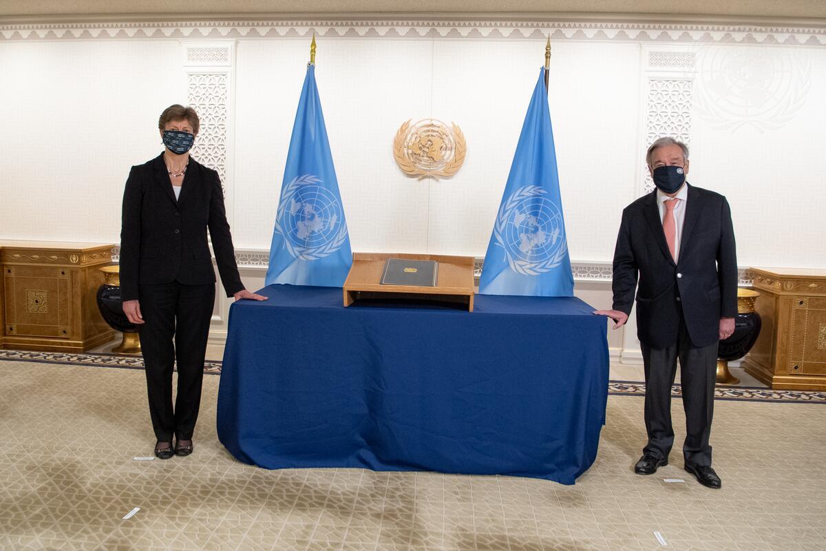 Barbara Woodward (left), new Permanent Representative of the United Kingdom of Great Britain and Northern Ireland to the United Nations, pays a courtesy call to Secretary-General António Guterres.